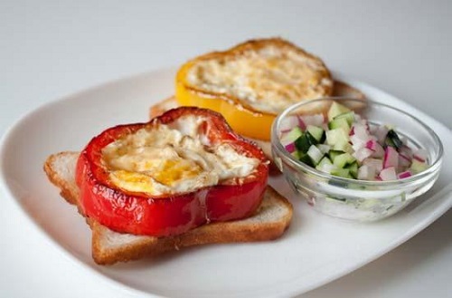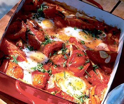 Обдай помидоры крутым кипятком, срежь верхушку, вынь сердцевину. Соли-перчи помидоры внутри. Можно добавить немного масла. Выпускай в каждый по яйцу и ставь в духовку. Когда белок побелеет, подавай на стол. Особая ценность данного рецепта — он подходит и для микроволновки. Напомним, что целое яйцо в микроволновке не взрывается только в том случае, если у тебя в наличии имеется Microwave Egg Boiler — специальный контейнер, в который можно залить воду и положить яйца.