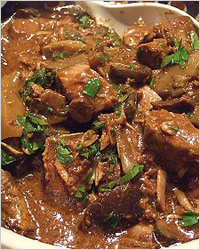 Нарежьте мясо кубиками величиной 2 см. На сковороде с растительным маслом потушите мясо, постоянно помешивая. Нарежьте грибы пластинками и добавьте к мясу. Морковь нарежьте кубиками и также положите в сковороду. Потушите до полуготовности мяса. Нарежьте зелёный лук и чернослив без косточек, миндаль измельчите. Добавьте всё в сковороду с мясом, посолите, поперчите, добавьте специи и потушите под крышкой почти до готовности. Помидоры нарежьте ломтиками, выложите в сковороду, потушите минут 5 и положите измельчённую черемшу. В самом конце добавьте зелень.