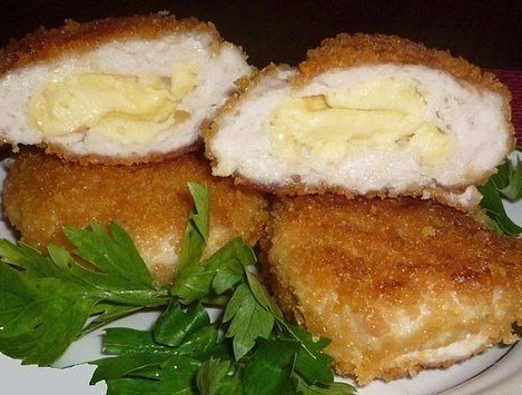 Значит так. Как это назвать, я не в курсе. Это что-то типа отбивных из курицы. 1. Берем куриную грудку, нарезаем ломтями толщиной милиметров в восемь. 2. Отбиваем курицу молоточком. Чуть-чуть. Главное - не перестараться, кура все таки мясо нежное. 3. Натираем наши отбивные солью и перцем. 4. Обваляем в муке. 5. Обмазываем яйцом (ну там яйцо разбиваем, перемешиваем..). И именно обмазываем, а не плюхаем в него. 6. Обваляем в муке. 7. Поджариваем на раскаленной сковородке, на растительном масле, до золотистого цвета. Выглядит это так: Я правда не совсем до золотистого жарил, но было вкусно. http://www.radikal.ru