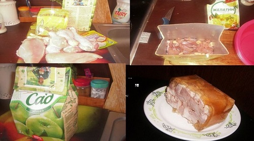 800 г курицы; приправа для курицы; 10 г желатина; пустой пакет из-под сока.