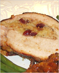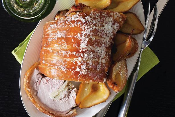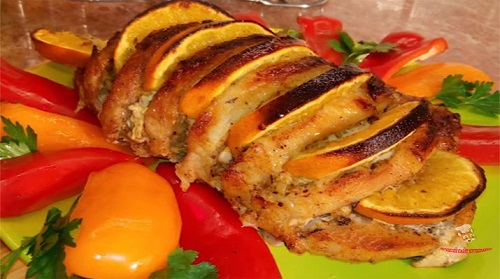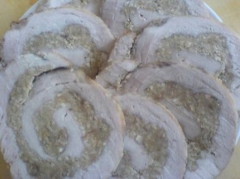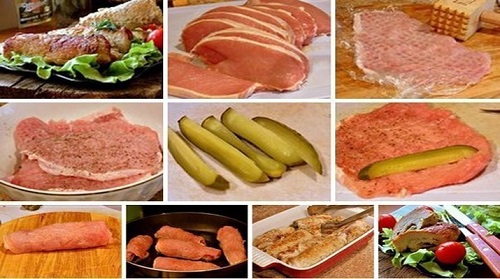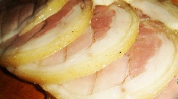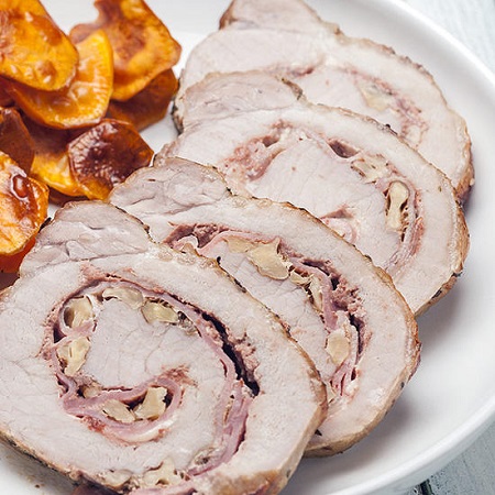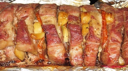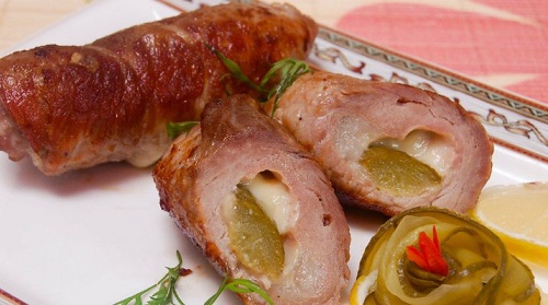 Внутрь положите нарезанный пластинками копченый бекон и сверните мясо рулетом.