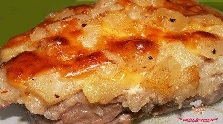 Такое мясо получается очень нежное, мягкое и вкусное. Блюдо по виду выглядит довольно красиво, поэтому, его можно приготовить на праздничный стол. Подать мясо можно с любыми соусами. Для приготовления оригинального блюда следует приобрести кусок мяса такой, чтобы его можно было нарезать как на отбивные. Картофель следует использовать тот, который предназначен для запекания.