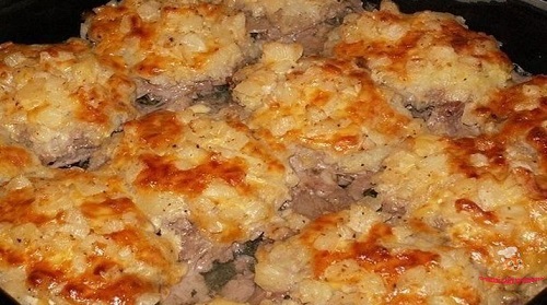 Мясо вымойте, нарежьте на куски. Хорошо его посолите и поперчите. Выложите мясо в форму для запекания. Очистите картофель, а затем натрите его на крупной терке. Добавьте к нему соль, перец, майонез и муку. Хорошо перемешайте картофельную массу ложкой. Выложите картофельную массу сверху на мясо. Отправьте форму в разогретую до 190 градусов духовку на 40 минут. Спустя указанное время аккуратно достаньте форму из духовки. Выложите блюдо на тарелку и подайте к столу! Приятного аппетита!