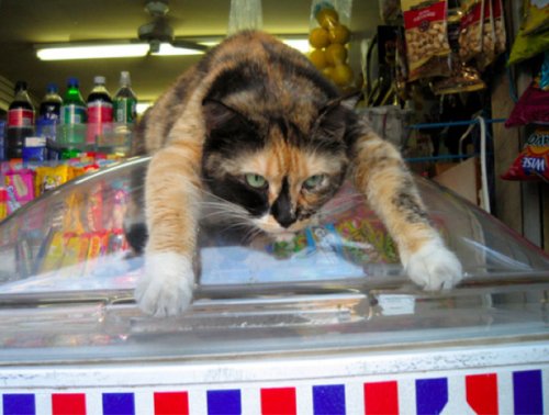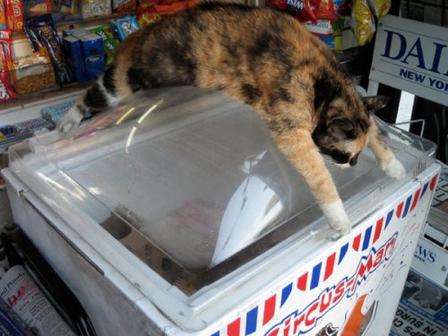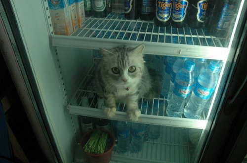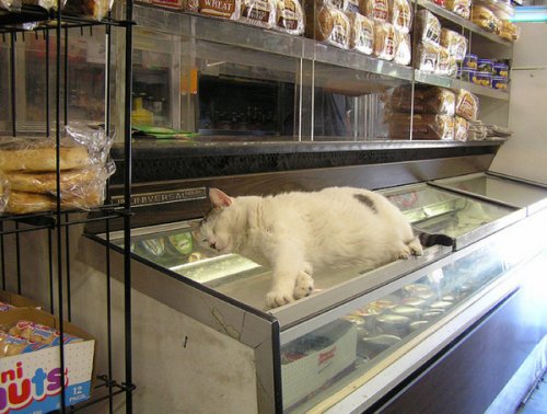 http://www.newsru.co.il/world/07mar2010/cat701.htmlГодовалый черно-белый кот провел около четырех недель на складе замороженных полуфабрикатов, представляющем собой огромный холодильник.Судя по всему, кот попал на склад на грузовике, привозящем новый товар, и был помещен в холодильник вместе с сотнями упаковок горошка и моркови. Работникам склада удалось поймать несчастное животное спустя месяц, пишет The Sun. У кота были отморожены уши и хвост, но он был жив.Во время своей вынужденной зимовки он питался зеленым горошком и добывал себе питье, облизывая глыбы льда.Спасенный кот получил имя "Фрости" (от английского frost, "мороз") и нашел теплый дом и хозяина (одного из сотрудников склада)..