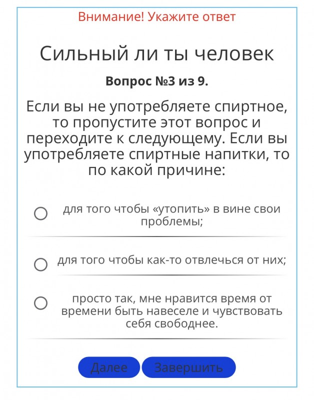 Тест предлагает пропустить вопрос, и тут же не пускает дальше, просит ответ)