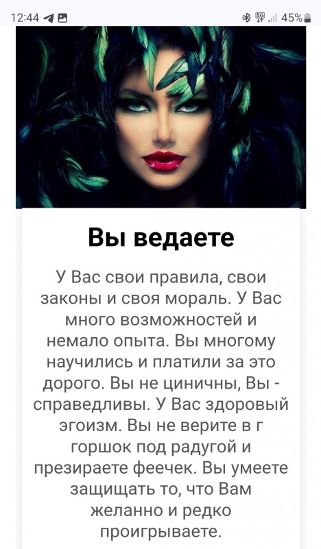 Вы ведаете У Вас свои правила, свои законы и своя мораль. У Вас много возможностей и немало опыта. Вы многому научились и платили за это дорого. Вы не циничны, Вы - справедливы. У Вас здоровый эгоизм. Вы не верите в горшок под радугой и презираете феечек. Вы умеете защищать то, что Вам желанно и редко проигрываете. ShakuDancer Мне кажется твой результат похож на тебя Сама как считаешь ? -------------------- Подарки: (Всего подарков: 629 ) |