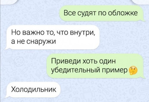 И всё же холостяк холостяку рознь, видимо. )) Недавно, прикола ради, посмотрел сколько у меня сортов нарезной колбасы в холодильнике (да, это было после еженедельной закупки, но всё же), оказалось девять сортов, сыра шесть (только нарезных). Жить без свежих овощей и фруктов вообще не знаю как... так что это скорей у "недавно случившихся" холостяков так. У холостяков с опытом всё весьма разнообразно, ни в чём себе любимому не отказываешь ведь. Интересно... Можно было бы БЛЕФУ провести... ,, Что в моем холодильнике,, ))))) Сидели бы, определяли по начинке холодильника, кто есть кто?))) -------------------- Осторожно—душа!Не подходи—поранишь, убьёт.....