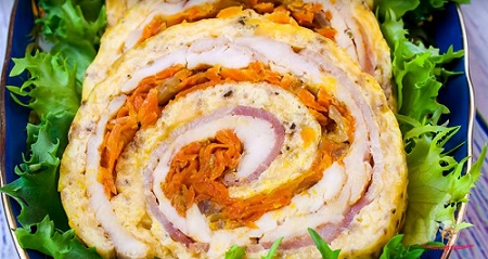 ![]() Нам потребуется: Пласт из сыра: Яйца - 4 шт.; Сыр - 400 г; Сметана - 200 г; Сушеный чеснок - 1 ч.л.; Орегано - 1 ч.л. Начинка: Куриное филе - 600 г; Соль - 1\2 ч.л.; Чеснок сушеный - половина чайной ложки; Куриная приправа - 1 ч. ложка; Ветчина или грудинка - 150-200 г; Морковка - 300 г; Лук - 1-2 шт.; Растительное масло - 2 ст.л. Пошаговый рецепт Для начала натрем сыр на крупной терке, кубиком мелким нарезаем лук, натираем на крупной терке морковку. Далее нарезаем филе курицы так, чтобы кусочки было удобно отбивать. Отбиваем куски куриного филе молоточком. В небольшую миску кладем соль, сухой чеснок, и приправу для курицы, все перемешиваем и посыпаем этой смесью каждый кусочек курицы с двух сторон. В сковороде с растительным маслом пассируем лук и морковку, до мягкости. В отдельной посуде смешиваем яйца, сметану, орегано, и чеснок сухой. Перемешиваем, добавим натертый сыр, и снова все смешаем до однородной массы. На противень, застеленный бумагой для выпечки, выливаем готовое тесто. Выставляем температуру в 180 градусов, и ставим противень на 20 минут. Далее снимаем с противня, даем остыть. Накрываем фольгой, и переворачиваем. Бекон раскладываем на пласте, сверху бекона кладем куриное мясо, поверх курицы идет слой овощной начинки, равномерно распределяем не доходя до краев, закручиваем плотный рулет. Кладем рулет на противень, и снова отправим в духовку на 50 минут при температуре в 180 градусов, а затем снимаем с него фольгу, и увеличиваем температуру до 200 градусов, и держим в духовке еще 10-15 минут, до появления золотистой корочки. » Кликните сюда для просмотра оффтоп текста.. «