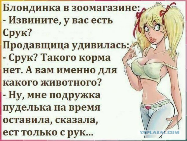 — Ты какой ждешь? — Я 25. — И я 25. Подходит 50. — О, вместе поедем! Встречаются в роддоме две блондинки. — А ты никак беременная? — Как ты догадалась? — А у тебя взгляд такой особенный, как при беременности! -------------------- -------------------- Подарки: (Всего подарков: 213 ) |