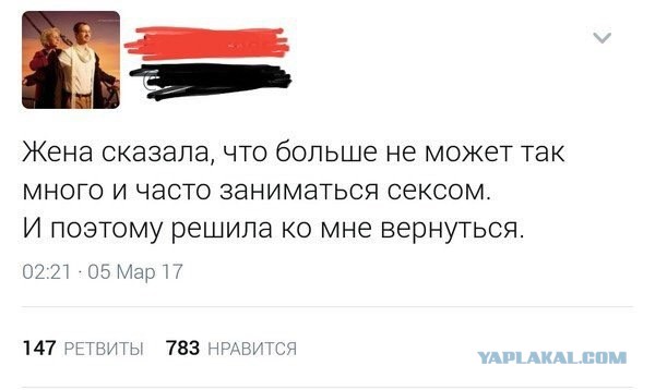 Супружеская пара попала в страшную автокатастрофу, в которой лицо мужчины было сильно обожжено. Осмотрев его, врач сообщил, что они не могут пересадить ему его же кожу с других частей тела, поскольку тот слишком худой. Поэтому жена предложила пожертвовать часть своей собственной кожи. Однако единственная кожа на её теле, которую доктор счёл подходящей для пересадки, оказалась расположена в области ягодиц. Муж и жена договорились, что никому не расскажут о том, откуда взялась кожа, и попросили доктора также сохранить их тайну. После того, как операция была завершена, все были поражены новым лицом мужчины. Он выглядел красивее, чем когда-либо прежде! Все его друзья и родственники только и говорили о его юной и прекрасной красоте! Однажды он остался наедине со своей женой, и его переполняли эмоции от её жертвы. — Дорогая, я просто хочу поблагодарить тебя за всё, что ты для меня сделала. Как я могу отблагодарить тебя? — Мой любимый, - ответила она, - я получаю всю необходимую благодарность каждый раз, когда вижу, как твоя мама целует тебя в щёку! Неравные браки Как правило, подавляющее большинство престарелых мачо, женятся на молодых и красивых девушках, тем самым, желая продлить свою увядающую молодость. Но как показывает практика, данным поступком, они лишь укорачивают свою старость. Случайности не случайны Жена мужу: — Как ни приду — ты всё бухаешь! Муж в ответ: — Как ни сяду бухать — ты опять приходишь! Жена и новый айфон — Знаешь, любимый, а не так уж и нужен мне этот новый айфон… — …что с машиной, Таня??? Правила карантина Может кто-то знает способ, как долго во время карантина никого не впускать в дом? А то муж уже пятый день стучится в дверь. Меня это уже начинает немного нервировать. Когда муж — алкоголик — Петя, сегодня одно объявление видела, в нём говорилось о том, что врачи-наркологи могут кодировать людей от пьянки во сне. — А мне это для чего? Я же во сне не пью! https://ruanekdot.ru -------------------- -------------------- Подарки: (Всего подарков: 213 ) |