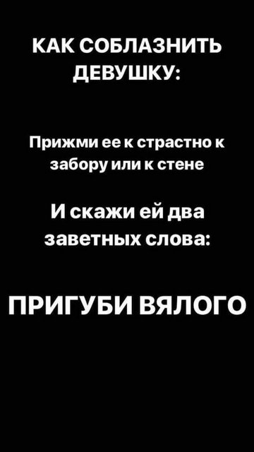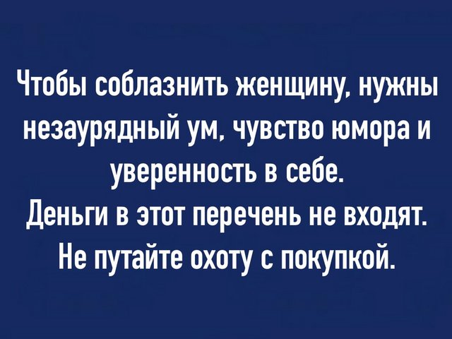 Хоть я и прожил еще достаточно мало, недолгое время на нашем голубом шарике, я знаю вот что… Чудачило ты неразумное... Фуфло, всё что ты перечислил... Мужик должен быть брутален и харизматичен. Всё. Даме важно, чтоб не стыдно было людЯм показать... А твои "причёска, одежда и чувство юмора" никому на х@р не нужны... А, за юмором дама на Петросяна сходит...На нем всегда присутствовала Сила, и Красота. Сила без Красоты, как известно заканчивается , теряется на порно сайтах, трассах, где не пойми что подхватить можно, от кого угодно, или со своей девчонкой правой ручонкой, что в принципе идет одной дорогой с порно сайтами. Так вот я усвоил что главное чтобы найти свою половинку, с женской точки зрения: 1)Мы должны быть оригинальными, быть то в высказываниях, одежде, причёске, или в чём, либо другом. 2) Схожи с ними, а не с угрюмым лицом, и поникшим настроением, а выражая свои положительные эмоции, в полной мере. 3) С чувством юмора, потому, что они не хотят быть с теми, у которых кислая рожа, видна за километр и без очков. 4) Уверенными в себе. Девушкам, нравиться мужчины, которые уверены в себе, потому, что на них всегда можно положиться, с таким ничего не страшно. -------------------- "Если вас укусил осёл, вовсе не обязательно кусать его в ответ..."