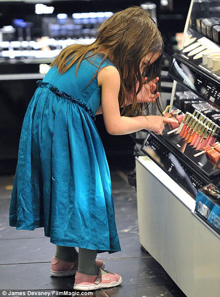 Вот Сури выбирает помаду. Моя дочь делает точно так же! И попробуй оттащи.. такой ор будет - мама не горюй. А если запрещать, то потом найдет, вытащит из сумки и все равно размолюется.