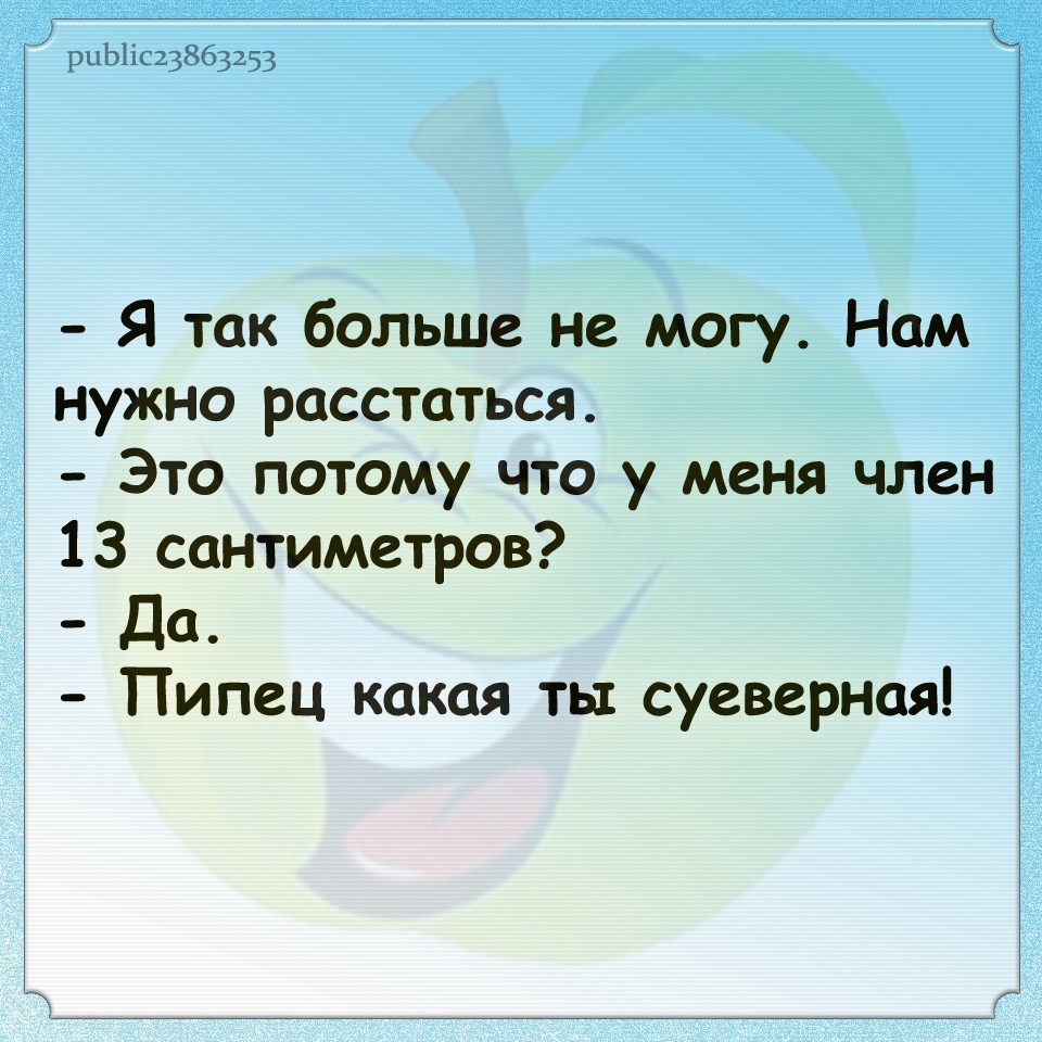 но сквозь дрему слышит, как внизу молодые шебуршатся. Старикан, засыпая, посмеивается про себя:...эх молдость, молодость... А внизу шепчутся: - давай стоя - ну давай - а давай терерь сидя - давай - давай ты сверху - давай - давай валетиком - давай - давай раком - давай - давай кандрибобиком - давай Опа!!! Старикана аж подбросило, че за дела - ни разу не слыхал. Дай хоть подсмотрю! Нагнулся, вглядывается - ниче не видать... темень. Высовается дальше... не видать... дальше... не видать... Гнулся, гнулся, пока с полки не полетел. Шум на весь дом... ушаты, прихваты, кастрюли, котелки все по дороге прихватил. Поднялся кое-как, бок почесывает, пытается обратно заползти. В это время дочка с испугом спрашивает: - что случилось, папочка?... - ниче не случилось, дочка, просто еб....сь надо по-людски!!! Вопрос: Кто такой настоящий муж ? Ответ: Настоящий муж это тот, кто придя домой и застав жену с любовником скажет "Ну вы тут заканчивайте, а я пока сварю кофе" Вопрос: А кто такой настоящий любовник ? Ответ: Тот, кто в этой ситуации сможет закончить. Подходит дочка к папе и говоpит: - Папа! Че делать?! Ко мне пацаны на дискотеке пpистают, е&аться зовут. Папа: - А ты спpоси, как сына назовешь. Hа дискотеке... Подходит пацан, говоpит - пойдем, мол, пеpепихнемся. А она: - Как сына назовешь? Обломался. Подходит дpугой: - Пойдем пеpепихнемся. - Как сына назовешь? - Да пойдем, пойдем. Заводит в кусты, вые%ал. Она: - Ну как сына-то назовешь? Он (завязывая пpезеpватив): - Если отсюда выбеpется, то Дэвидом Коппеpфильдом. Сообщение отредактировал founirskai - 15.04.2014 - 17:08 -------------------- Подарки: (Всего подарков: 83 ) |