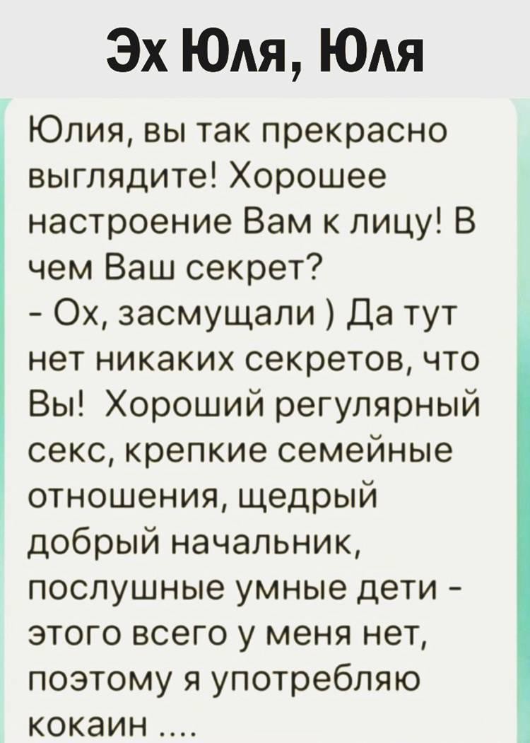 Ослышки Иду домой, поравнялся с какой-то дамой и слышу из ее уст: «Я шестой!» Я так чуть напрягся, посмотрел на нее, дама в возрасте, всякое бывает. И она повторяет: «Я шестой, говорю же!» Ну а у меня настроение такое хорошее еще, говорю: «Я первый!» Теперь уже она на меня смотрит как на дурака и дальше выдает: «Яша, говорю же, остановись!» Там собака мелкая рядом бежала, Яшей зовут. Так стыдно давненько не было. © DimGris / Pikabu Знакомая пригласила в гости и сказала, что у них там прут сутками. Я не поняла, что у них там прут, подумала, опасно к ним ехать, воровство у них там. Оказалось, пруд с утками. © Вера Рындич / Facebook Сообщение отредактировал Айя-Софи - 22.03.2022 - 7:30 -------------------- Осторожно—душа!Не подходи—поранишь, убьёт.....