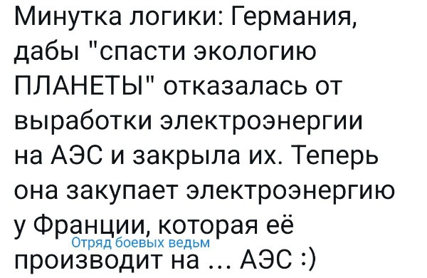 ,, Следующий шаг к достижению поставленной Америкой цели по разгрому промышленности в Европе вполне логичен - разрушить атомную энергетику. Кстати, некоторые правительства не хотят даже дожидаться снижения цен на газ. Они уже сегодня заявляют о своём желании отключить АЭС в своей стране. Отгадайте кто у нас самый умный в ЕС? Правильно - Шольц. Ну, кто бы сомневался в его незаурядных умственных способностях. Бербок ему в помощь, и у них всё получится! Шоу продолжается. Скоро Германия начнёт тушить пожар энергетического кризиса чистейшим бензинчиком. Дурь, конечно, но они именно в этом мастера,, В Германии отключили последние атомные энергоблоки отрапортовал Хабек. Должны были отключить ещё в декабре 2022, но из-за форс-мажора с газом срок отключения перенесли на весну 2023. Вполне допускаю, что Земля из-за этого не остановится, Германия не исчезнет, просто станет другой, а немецкие обыватели привыкнут к новому порядку и лет через 20, возвращаясь с заработков из Китая или США, будут рассказывать своим детям о том какой была их страна раньше, в эпоху индустриализации. А может быть, придёт какой-нибудь новый фюрер и призовёт возродить арийский дух, и история повторится... -------------------- Осторожно—душа!Не подходи—поранишь, убьёт.....
