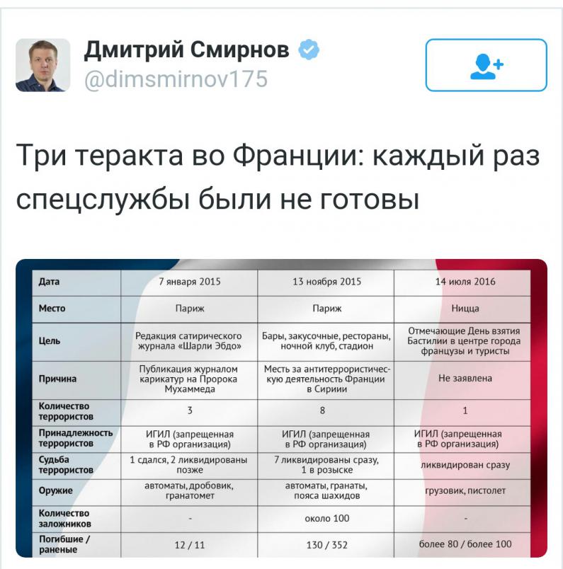 Францию примерно наказывают за попытку примирения с Россией. Ага, про Турцию и недавний теракт тоже так говорили. конспирологи...а как же тогда тот факт, что в стане самого Хозяина, в самих США терактов не меньше, чем во Франции? она себя саму за что наказывает? что касается Турции - так там даже в мирный 2015г. произошло около 200 терактов; и Стамбул - это южная Турция, сфера влияния курдов, с которыми у Эрдогана сейчас война вообще-то так что не сходятся нити мирового заговора в единую картину.... -------------------- Если имею дар пророчества и знаю все тайны, и имею всякое познание и всю веру, так что могу и горы переставлять, а не имею любви, - то я ничто. И если я раздам все имение мое и отдам тело мое на сожжение, а любви не имею, - нет мне в том никакой пользы" (1 Кор.13:1-3).