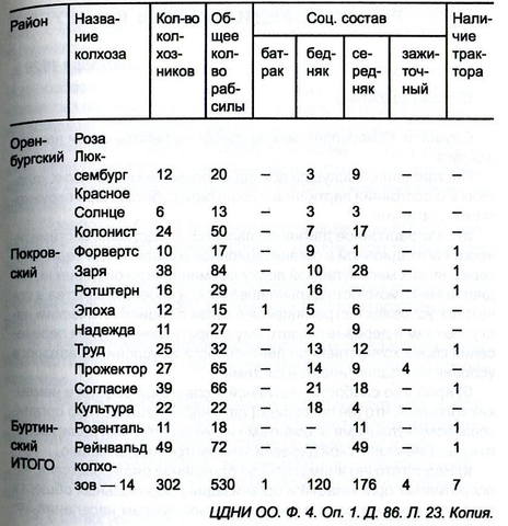 Из протокола заседания Бюро Буртинского райкома ВКП(б) о результатах обследования по немецкому вопросу 4 января 1930 г. Постановили: 1. Отметить удовлетворительный рост и направление развития немецких хозяйств района в разрезе классового расслоения по сплошным показателям. 2. Хотя эмигрантского движения в районе не было, все же отдельные настроения за выезд за границу имели место, особенно в районе Федоровского сельсовета, и до сих пор еще не изжиты. 3. Отметить крайне неудовлетворительное обслуживание немецкого населения в культурно-просветительной области, а также в ветеринарной и медицинской помощи. 4. Отметить, как ненормальность среди немецкого населения, почти полное отсутствие классового расслоения и подмену его круговой порукой, большое влияние зажиточных слоев населения на бедноту и экономическое закабаление последней со стороны зажиточной части населения. 5. Отметить недостаточное внимание к немецкому вопросу и недостаточную чуткость к запросам немецкого населения со стороны районных организаций. В качестве практических мероприятий считать необходимым проделать следующее: 1. Провести работу по развитию классового расслоения среди немцев, стремясь вырвать бедноту из-под влияния зажиточной части населения. 2. Взять курс на максимальный охват немецкого населения коллективными формами хозяйства. Для этого посылать в немецкие сельсоветы лучших уполномоченных и развернуть массовую разъяснительную работу о значении коллективизации.. 4. Предложить ячейке ВКП(б) племхоза повести работу по влечению в ряды ВКП(б) немцев-активистов и батрацко-бедняцкой прослойки населения. Для усиления партийного влияни на немецкую часть населения в ближайшее время создать в крестьянском сельсовете кандидатскую группу. 5. Поручить фракции РИКа проработать вопрос о переводе делопроизводства в немецких сельсоветах на родной язык. 6. Просить окружком ВКП(б) о присылке для постоянной работы в Буртинском районе нескольких немцев-коммунистов. 7. Для культурного и политического обслуживания прикрепить немецкие населенные пункты к ячейке племхоза. Предложить ячейке племхоза немедленно связаться со всеми немецкими населенными пунктами и повести среди них работу. Ответственность за политическое состояние немецких сельсоветов возложить на ячейку племхоза. 8. Предложить ячейке племхоза наладить медицинское и ветеринарное обслуживание немецкого населения силами племхоза... 10. Предложить фракции РИКа передать обслуживание пос. Блюментальского от Ключевского потребительского общества Крестьянскому потребительскому обществу. 11. Предложить фракции РИКа в ближайшее время проработать вопрос об организации и оборудовании в пос. Федоровском немецкой избы-читальни... 13. Поручить фракции РИКа проработать вопрос об открытии немецкой школы в пос. Старицком в ближайшее время. 14. Предложить тов. Савицкому развернуть в немецких селах работу общественных организаций. 15. Предложить тов. Чашкину в ближайшее время расследовать дело о кабальных сделках с обменом земельных участков между поселками Блюментальским и Капанским. Виновных привлечь к судебной ответственности. 16. (объяснение автором вырезано, т.к. не лицеприятно для немцев)...развернуть антирелигиозную пропаганду среди немецко-населения. 17. Предложить женоргу повести работу среди женщин-
