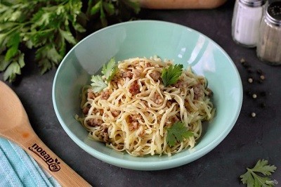 ![]() Приготовить лапшу с фаршем в домашних условиях, что может быть проще? Блюдо простое, сытное и очень вкусное! Отличный вариант для обеда или ужина на скорую руку. У меня минимальный набор ингредиентов, которые не составит труда найти практически на любой кухне, но вы по желанию можете смело разнообразить рецепт. Добавляйте томаты, болгарский перец, чеснок, простор для фантазии здесь огромный! Фарш у меня смешанный, но подойдет любой. Можно взять говяжий, свиной и легкий куриный. Попробуйте, блюдо несмотря на всю свою простоту очень вкусное, подойдет для всей семьи. Ингредиенты: Лапша — 200 г Фарш мясной — 300 г Растительное масло — 3 ст. ложки Лук — 1 шт. Куркума — 1 щепотка Кориандр — 1 щепотка Базилик — 2-3 щепоток Сливочное масло — по вкусу Соль — по вкусу Перец черный молотый — по вкусу Как приготовить Налейте в кастрюлю воду, доведите до кипения, добавьте соль, куркуму и лапшу. Отварите лапшу согласно инструкции на упаковке, откиньте на сито или дуршлаг и заправьте сливочным маслом. Лук нарежьте кубиками и обжарьте на растительном масле до мягкости. Добавьте фарш, соль, перец, базилик и кориандр (можно использовать свои любимые специи). Обжарьте фарш помешивая и разбивая лопаткой комочки до полной готовности. В самом конце добавьте лапшу, перемешайте, прогрейте все вместе в течение 2-3 минут и снимите с огня. Лапша с фаршем готова. Приятного аппетита! -------------------- Подарки: (Всего подарков: 832 ) |