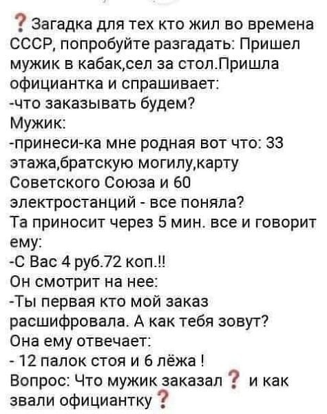 Водка, килька, папиросы,спички и имя Наташа вроде Про "беломор" я и сам догадался )))))))) Вместо кильки называют шпроты.И Наташа есть,вроде...Только,не могу найти в её имени столько палок -------------------- Херенвен вам в хэйлунцзян! )))))