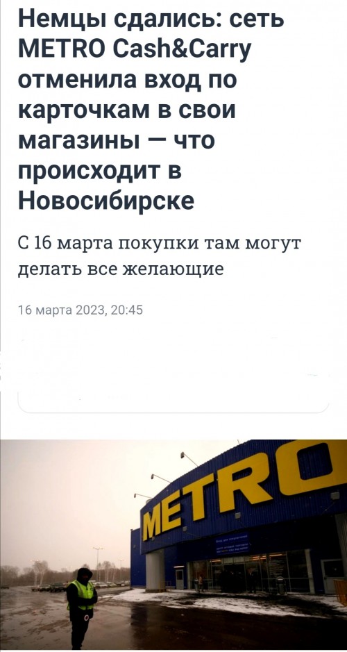 » Кликните сюда для просмотра оффтоп текста.. « Сеть METRO Cash&Carry объявила, что с 16 марта перестала требовать карты покупателей при входе и оплате товаров. Изначально сеть позиционировала себя как торговый центр для мелкооптовых покупателей. В Новосибирске магазин теперь также будет работать в формате обычного гипермаркета. У меня есть карточка, но мне не очень нравился ассортимент в маге.. Ездила редко туда. В Метро отоваривались лет 20 назад, потом появились магазины получше Хотя они существуют у нас до сих пор, ну до недавнего времени точно -------------------- Подарки: (Всего подарков: 887 ) |