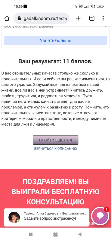 » Кликните сюда для просмотра оффтоп текста.. « Ваш результат: 5 баллов. В вас очень много положительных качеств. Вы чуткий, но в тоже время способны быть решительным, никогда не перекладываете свои проблемы на окружающих и убеждены, что только сам человек несёт ответственность за свои поступки. Ваше трудолюбие и оптимизм помогают вам идти по жизни легко и добиваться поставленных целей не прибегая к негативным действиям. Окружающие ценят вас за честность и доброту. -------------------- Только научившись ценить то, что имеете, вы получите все то, о чем мечтали.