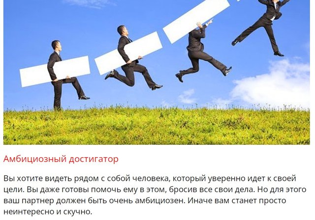 Если есть желание узнать, какой человек должен быть рядом с вами - то вам сюда --->> https://konstruktortestov.ru/test-6432 Мой результат - Легкий на подъем О, ваш выбор говорит о многом! Прежде всего, вам нужен человек, который будет поддерживать вас в любом начинании. Скажем больше, он должен с охотой принимать участие в ваших сумасшествиях. Вы хотите многое узнать и попробовать, и ваш партнер должен помочь вам в этом. Сидеть и ждать у моря погоды - не для вас. Вы торопитесь жить, зная, что у вас всего одна жизнь. -------------------- Только научившись ценить то, что имеете, вы получите все то, о чем мечтали.