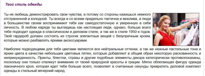 « Ты не любишь демонстрировать свои чувства, а потому со стороны кажешься немного отстраненной и холодной. Ты всегда и со всеми предельно тактична и вежлива, а люди в большинстве своем воспринимают тебя как самодостаточную и уверенную в себе личность. В любом наряде ты выглядишь как настоящая леди, однако, больше всего тебе подходит одежда в классическом и деловом стиле, а так же в стиле 1950-х годов. Твой гардероб должен состоять из строгих элегантных вещей с безупречным кроем, которые можно разбавлять яркими аксессуарами. Наиболее подходящими для тебя цветами являются все нейтральные оттенки, а так же нежные пастельные тона и яркие цвета в качестве небольших цветовых пятен, которые добавляют в общий образ некоторую раскованность и непринужденность. Принты, блестки, стразы и другие подобные элементы декора категорически противопоказаны, поскольку они только отвлекут внимание от твоей природной красоты и грации. Мягко облегающая фигуру одежда лаконичного кроя, которая идет тебе больше всего, позволяет в считанные секунды превратить деловой комплект одежды в стильный вечерний наряд»