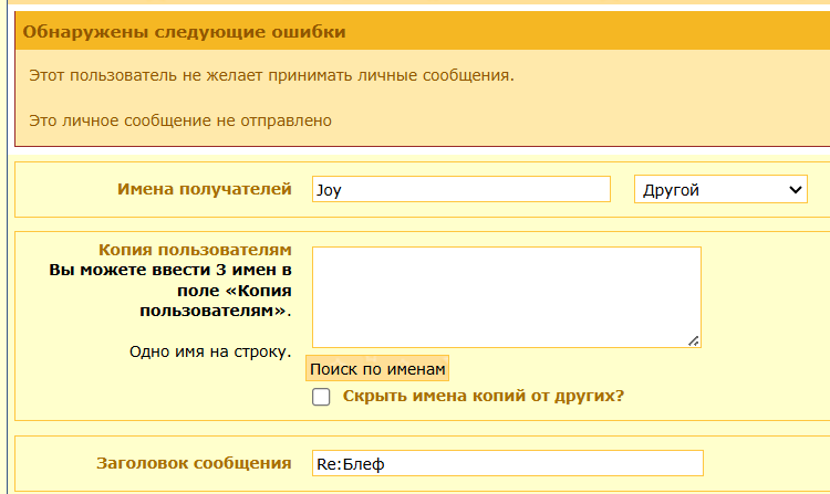 Завтра придут не бузи бузяка)) Я её открыла)) Еще и угрожает вот именно так у меня все работает наоборот Сообщение всё так же не отсылается, всё как на картинке выше. )) Ладно, играем пока по твоим правилам, бузить позже буду. ))) В общем - принято. -------------------- Подарки: (Всего подарков: 792 ) |