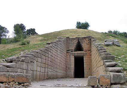 Вне крепостных стен находится «Могильный круг В», система толосовых захоронений, возраст которых не столь почтенен, как возраст шахт в «Могильном круге А». Толосовый могильник может состоять из 35 рядов круговой кладки. Огромные камни лежат один на другом, причем каждое следующее каменное кольцо уже предыдущего. В древности таким же способом строили пчелиные ульи. Могилы этого типа сооружались на протяжении примерно 200 лет, с 1400 по 1200 год до н. э. Обычно они были выкопаны в склоне холма. Огромный проем в конце длинного тоннеля служил входом в могильник. После каждого захоронения проход замуровывался и тоннель засыпали землей. Наиболее интересными толосовыми захоронениями Микен являются так называемые сокровищница царя Атрея (отца Агамемнона) и могила Клитемнестры. Но хотя они и относятся к «нужному» периоду, нет никаких реальных доказательств того, что это действительно их могилы. Около 1150 года до н. э. микенская цивилизация внезапно прекратила свое существование. Город был либо разрушен, либо покинут по другой причине. Это была последняя из ранних греческих культур, и с ее исчезновением страна по- грузилась в эпоху, известную под названием «темной».