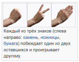 "Игроки считают вместе вслух «Камень… Ножницы… Бумага… Раз… Два… Три», одновременно качая кулаками. На счёт «Три» они одновременно показывают при помощи руки один из трёх знаков: камень, ножницы или бумагу.