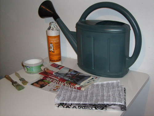 Необходимые материалы и инструменты лейка; газета; кисточки; лак и клей; рисунки для декора.