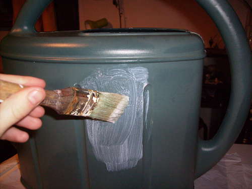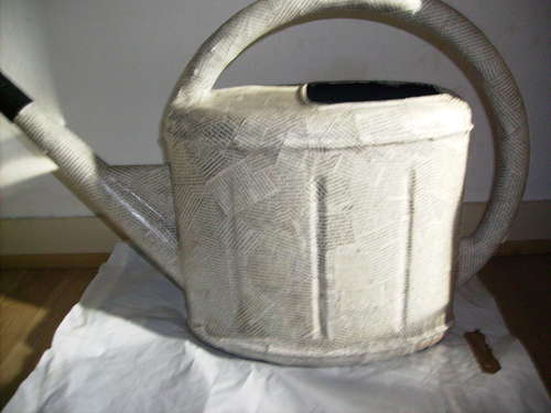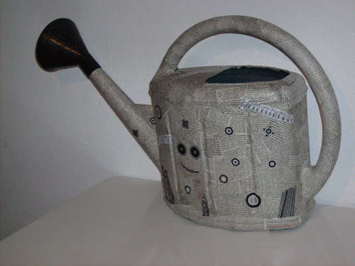 2-Обклейка Теперь обмажьте лейку клеем и начните приклеивать вырезанные полосы, в произвольном направлении. Если бумага тонкая, обклеивайте в несколько слоев. Приклеили газету, сверху снова мажете клеем, наклеиваете еще один слой. И так по всей поверхности лейки, включая носик и ручку.