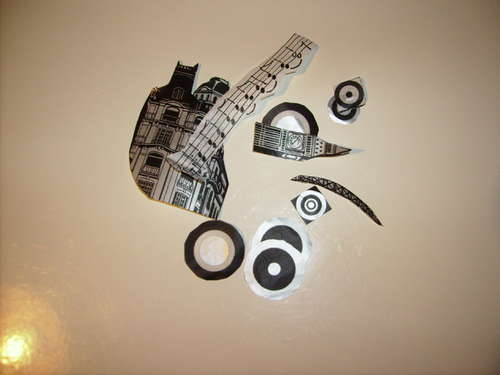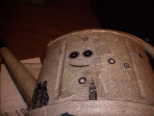 После того, как поверхность лейки высохла, можно приступить к декору. Может украсить как угодно, прикрепить ленточки, бантики и т.д. Для нашей подставки для зонтов был выбран стиль минимализма. Да и вообще, газету, если захотите, можете заменить на яркую цветную бумагу разных цветов. Итак, с помощью клея прикрепляем вырезанные фигурки к поверхности.