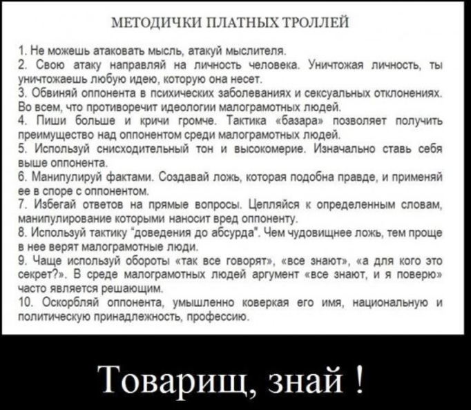 А при чем здесь "вирмени"? Кстати, а кто это? И при чем здесь "ненавидит" Я и "ненавидит" - это разные категории. Мне просто забавно, что такой махровый патриот РФ, как данный персонаж постоянно цитирует английскую домохозяйку в качестве высшего авторитета. Не русского какого-нибудь блогера, что было бы естественно, а эту дамочку, проживающую в ненавистной ему Великобритании , и не собирающуюся менять место жительства... Забавно же. Кстати. посмотрите на выложенный выше типа скрин методички. Узнаете себя по всем пунктам? Это тоже очень забавно выглядит. Теперь мы знаем точно как выглядит руководство к действию и для Вас и для Ваших единомышленников.
