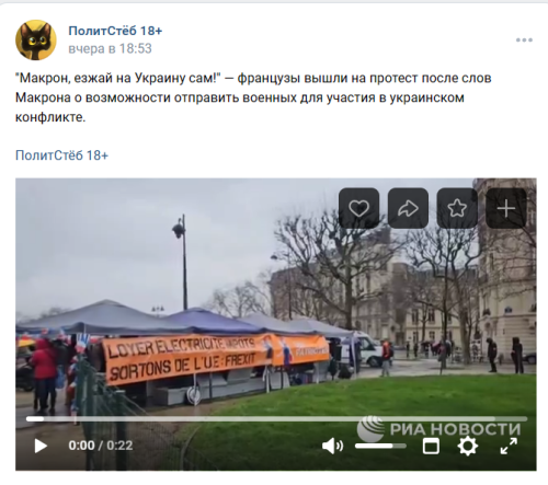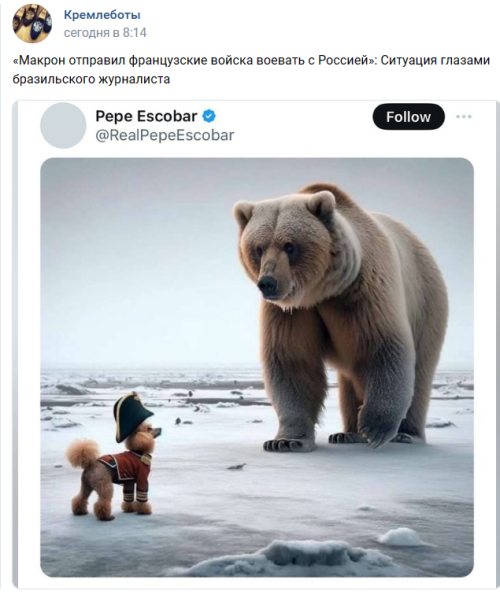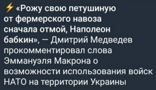 Но это ещё не всё, сегодня же, этот гасконец потребовал прекратить всю заваруху и велел объявить "режим тишины" на время Олимпийских игр. Забавный персонаж, честное слово. В этот самый момент, в Париже начался марш против поставок продукции ВПК северному Причерноморью, и к бастующим фермерам, закрытым больницам и стекающим отходам жизнедеятельности с административных зданий, добавились новые недовольные. Если всё так пойдёт и дальше, то через недельку-другую, к фермерам добавятся ещё и французские солдаты. Никто за Маню впрягаться не хочет.