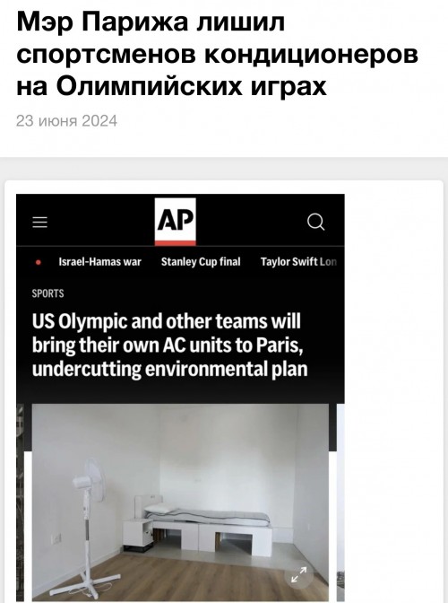 Жар костей не ломит: В Париже олимпийских спортсменов лишили кондиционеров Мэр Парижа хочет, чтобы Олимпийские игры были "экологически чистыми", поэтому принял решение убрать кондиционеры из отельных комнат спортсменов. Вместо этого им установили вентиляторы. Теперь олимпийские сборные США, Германии, Италии, Канады, Британии и Австралии везут в Париж свои собственные кондиционеры, чтобы охлаждать комнаты спортсменов…,,