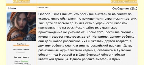 Financial Times пишет, что россияне выставили на сайтах по усыновлению объявления с похищенными украинскими детьми. Так, дети от восьми до 15 лет есть в украинской базе как пропавшие, но на российском сайте их украинское происхождение не указывают. Кроме того, россияне сменили имена и возраст некоторых детей. Например, одному ребенку они дали новое российское имя и указали другой возраст, а другому ребенку сменили имя на российский вариант. Дети, разысканные журналистами издания, оказались в Тульской области, под Москвой и в Оренбургской области вблизи казахской границы. Одного ребенка вывезли в Крым.