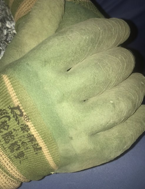 И хоть я взялся не спорить, но все же не удержусь: пребываю в уверенности, что эти перчатки рабочие, так как на нерабочих перчатках так в открытую не маркировались бы иероглифы, которые сколько-то портят внешний вид, а для рабочих это ничего... И обратите внимание какие на пальцах складки-морщины у перчаток - явно они не новые, а есть еще царапины-повреждения защитного влагонепроницаемого слоя на поверхности перчаток. Нет, это не замша - перчатка пропитывалась некоторым защитным составом и на запястье вижу не совсем ровную границу пропитки...