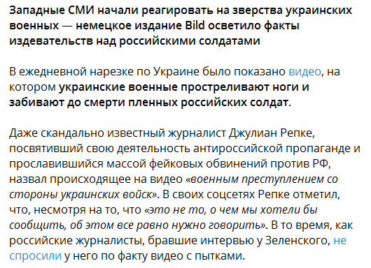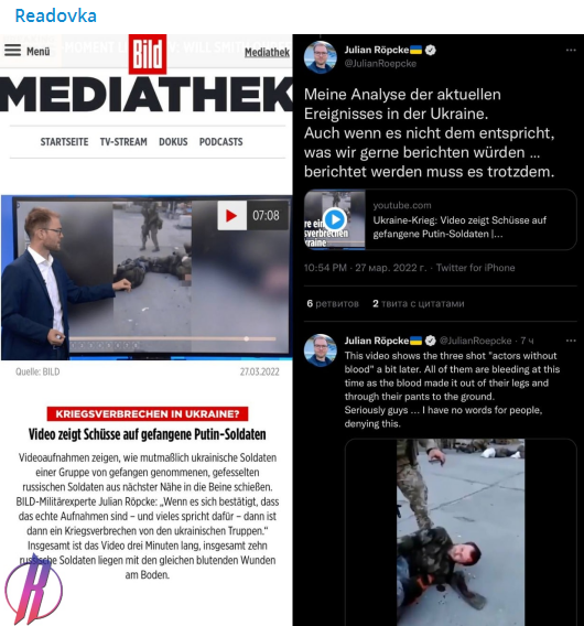 На странный материал немецкого таблоида обратила внимание русская журналистка Ольга Скабеева. Ей хватило одного кадра, чтобы понять, что к чему. В своём материале Bild показал, как украинские военные издеваются и простреливают ноги пленным русским солдатам. Титр внизу экрана сообщает, что зрителям показывают именно военные преступления против русских со стороны ВСУ. Отметим, обычно немецкий таблоид, наоборот, придерживается антирусской позиции. Кадры видео, где украинские военные простреливают ноги российским военным, попавшим в плен, прокомментировал эксперт немецкой газеты Bild Юлиан Рёпке 27 марта.