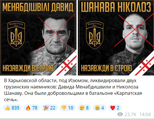 Следственным комитетом России расследуется уголовное дело в отношении командира «Грузинского национального легиона» Мамуки Мамулашвили по ч.ч. 1 и 3 ст. 359 УК РФ (вербовка наемников и их участие в вооруженном конфликте). Кроме того, в связи с публикацией в сети Интернет его призывов к насилию в отношении российских военнослужащих в действиях Мамулашвили содержатся признаки преступления, предусмотренного пп. «а», «б» ч. 2 ст. 282 УК РФ (возбуждение ненависти в отношении социальной группы военнослужащих, совершенное публично, сопряженное с угрозами применения насилия, лицом с использованием своего служебного положения).