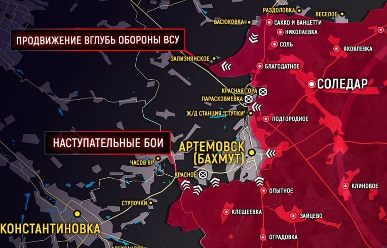 Клещи сжимаются – южнее Артёмовска (Бахмута) русские войска продолжают продвигаться к Часов Яру, сообщает Телеграм-канал Readovka.