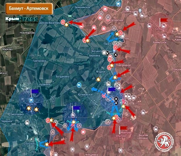 Российские войска активно пытаются обогнуть систему укреплений с севера и выйти на трассу Бахмут — Славянск, полностью лишив Бахмутский гарнизон снабжения. Кроме того, это позволит приблизиться к Берховке и в перспективе взять группировку в северных пригородах Бахмута в миникотел.
