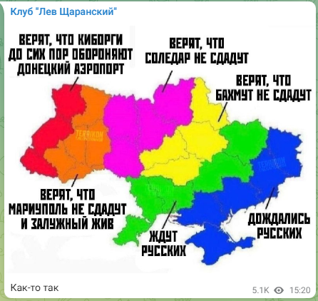 На вопрос, если ли «перемоги» у «хероев», Барабаш (гауляйтер городской военной администрации) уныло соврал, что захисники незалежностi отбили аж три позиции у «орков». Однако даже американский Институт изучения войны (ISW) в своей сводке за 22 мая был вынужден признать, что российские войска добились успехов в районе Авдеевки, хоть и назвал их «незначительными». В переводе с пропагандистского лексикона экспертов ISW это означает серьезное продвижение наших солдат.