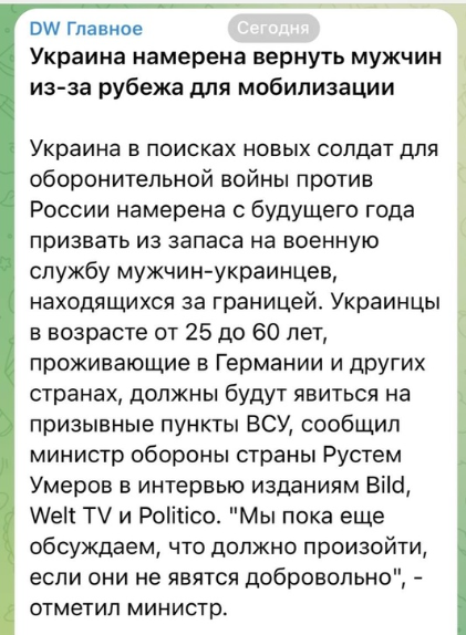 В отчаянных попытках найти новых солдат для ВСУ, он заявил, что украинским мужчинам, в том числе в Германии, предлагается обратиться в центры рекрутирования, — но в то же время ясно дал понять, что тех, кто не последует «приглашению», ожидает наказание.