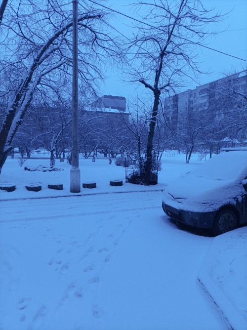 Смеркалось, пошёл снег, минус 10. Кота загнал домой, гулял сегодня днём с соседской кошкой в огороде, время ужинать и книжку читать!