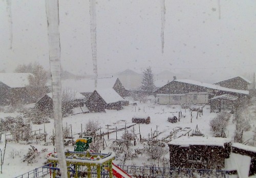 Сегодня всё было: с утра минус и снег, потом солнце временами, сосульки даже таять начали, затем снова набежали тучи и снег пошёл, подморозило к вечеру, как в апреле, о котором Обморочек грёзит!