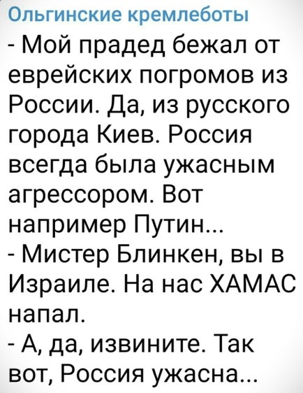 Но интересно то, что в своих рассказах мистер Блинкен никогда не упускает шанс пнуть Россию. Вот, например, про своего прадеда он говорит, что тот сбежал из Росси от еврейских погромов. Кстати, данную историю Блинкен повторил и сейчас, при посещении Израиля.