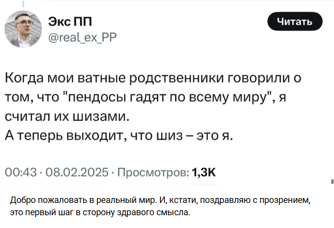 На то, как шеф хам пинает своего шакала Табаки – подлизу и русофоба, приятно посмотреть. С другой стороны, расширение США на Гренландию априори противоречит геостратегическим интересам России и угрожает ее позициям в Арктике, не говоря уже о том, что поведение Трампа – та еще отрыжка американского империализма.