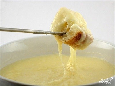 Надевать кубики хлеба на длинные вилочки и макать в сыр. Помешивать, пока хлеб полностью не будет покрыт сыром, затем достать и продолжать крутить вилку, чтобы сыр не капал на стол и на колени - он очень горячий.