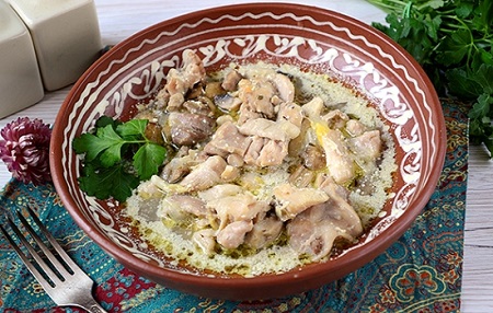 Потом выкладываем все по принципу тушеной картошки с курицей (только без томата) и выставляем режим «Мясо».